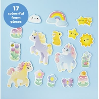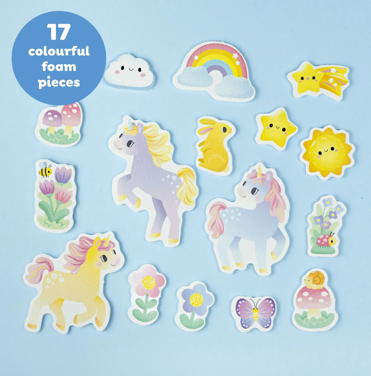 Bath time meets art time! Perfect for storytelling and pretend play, this magical unicorn-themed set includes 5 bath crayons and 17 colourful foam pieces that cling to bath surfaces and can be easily moved around to create endless stories.