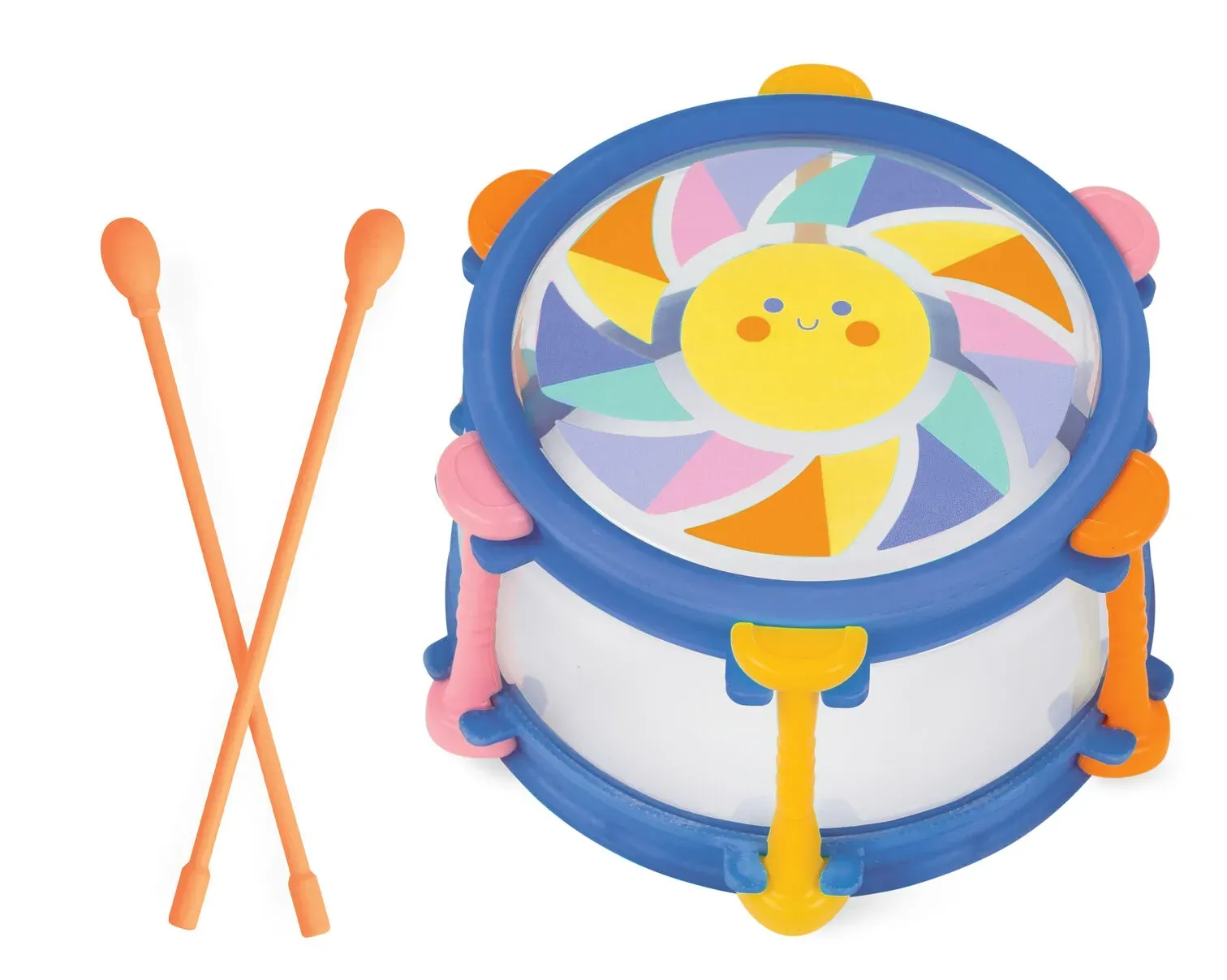 - Kid friendly bath drum with two chunky drumsticks