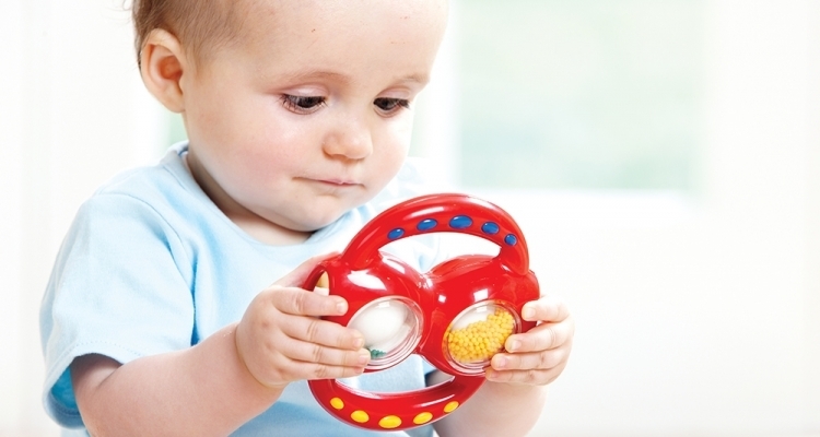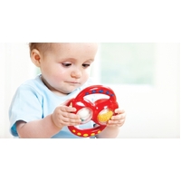 A big colourful rattle. Turn it upside down and watch the coloured beads flow out of one chamber into another. See the beads magically change colour as they leave one chamber and enter the other. Great for grasping and holding.
