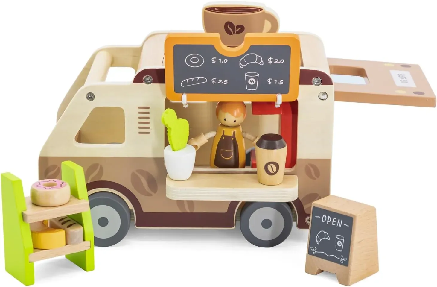 This play set offers a realistic role play experience. Comes with a barista, a pastry rack, donut, croissant, bread, coffee, plant, coffee sign, coffee machine, table and blackboard.