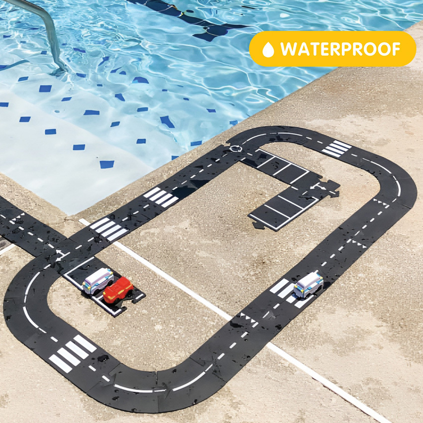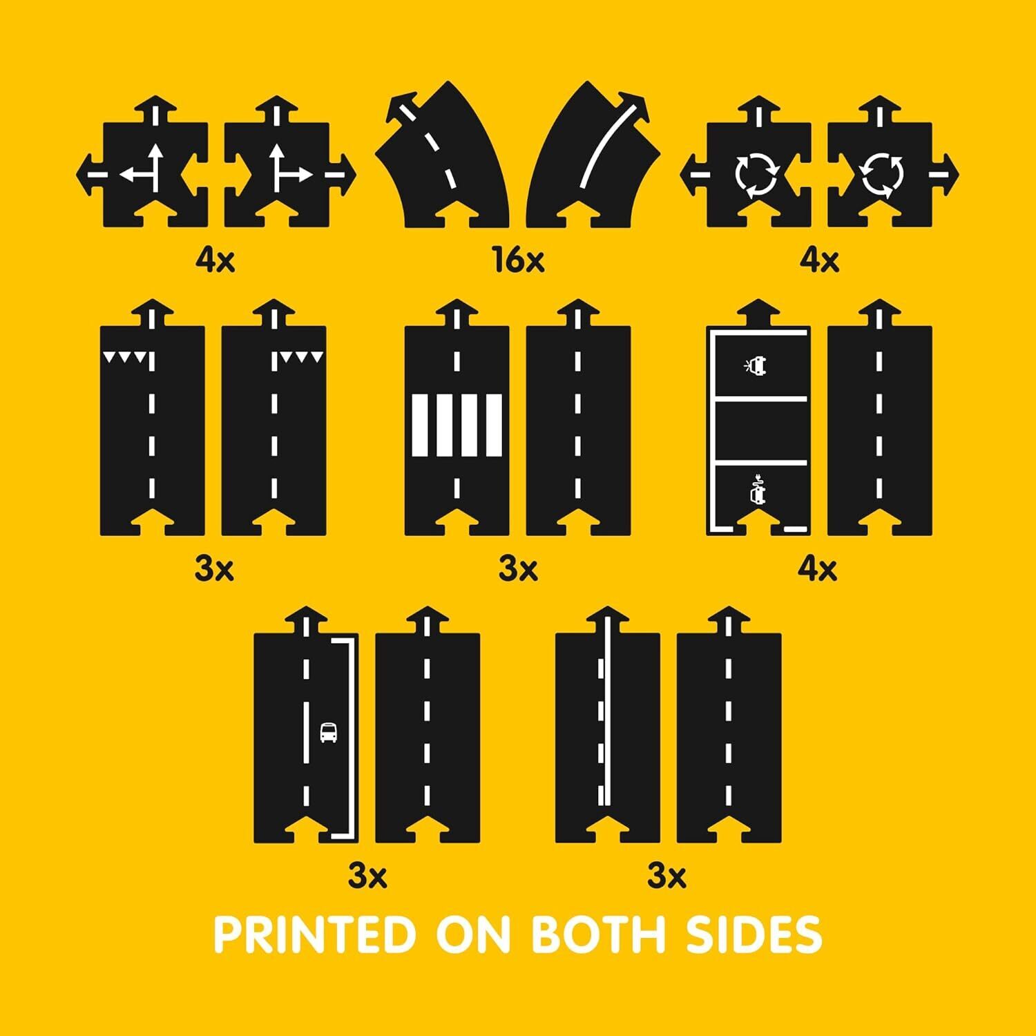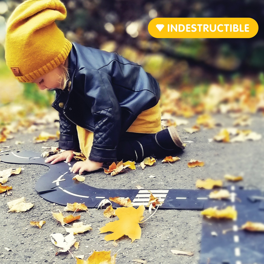 If you want to be King of the road, this is your set! 40 pieces of track offering maximum fun for everyone. This set is enormous and is highly recommended for kids that really love to play with cars. Large enough for multiple children and adults to play together at home, kindergarten or daycare centres. Combined with other toys already in their toy box this set will have them playing for hours on end. A flexible, durable toy, play can begin inside and continue outside. The track options are endless with 16 curves, 16 straights, 4 intersections, 4 roundabouts, car parking spaces, pedestrian crossings and other road markings printed on both sides of each track.