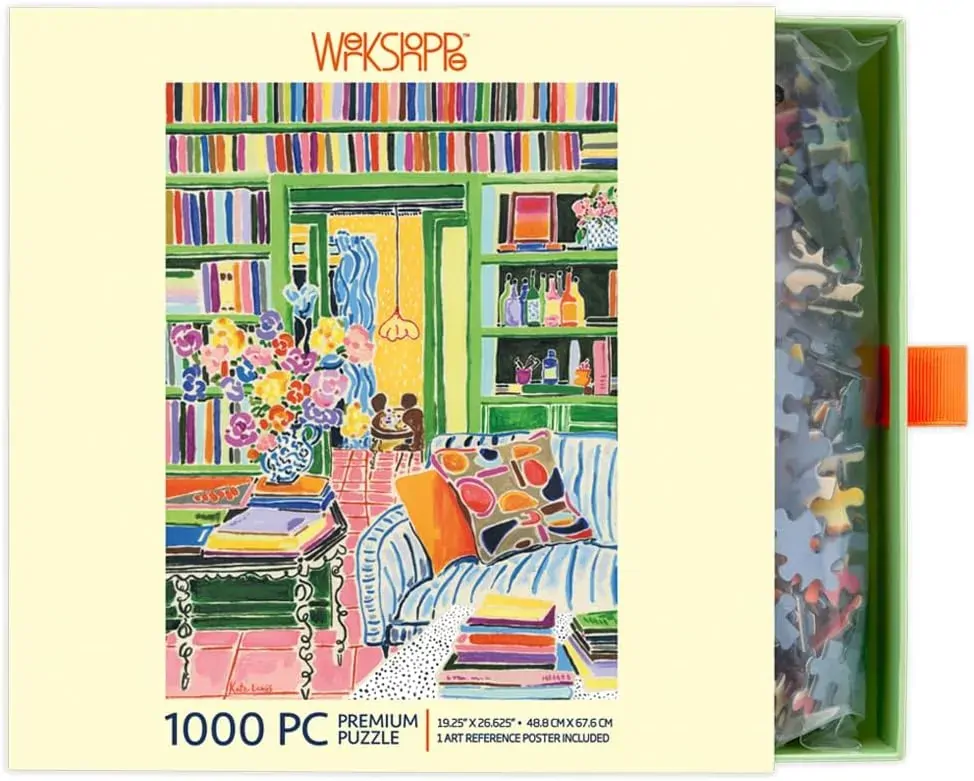 Step into a cozy, book-filled retreat with the WerkShoppe Books & Bouquet 1000-Piece Puzzle. This beautifully illustrated puzzle brings to life a charming reading nook, brimming with stacked books, vibrant floral arrangements, and inviting dcor. With ribbon random-cut pieces, each puzzle piece is uniquely shaped, adding an extra layer of challenge and satisfaction as you assemble this picturesque scene. Printed on 100% recycled board with non-toxic, vegetable-based inks, its an eco-friendly choice for puzzle lovers. The resealable zip-top bag keeps pieces secure, while the included two reference art inserts ensure an enjoyable puzzling experience. Perfect for book lovers, art enthusiasts, and anyone looking to unplug and unwind, this puzzle transforms screen-free time into a rewarding, hands-on adventure.